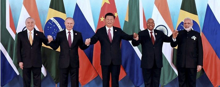 B jak Brasilia, R jak Russia, I jak India, C jak China i S jak South Africa. Na zdjęciu premier Indii stoi ostatni, zaś jako trzeci – Xi.