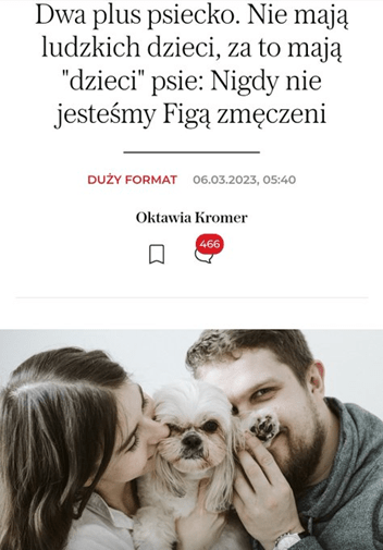 Bo, przynajmniej tak twierdzi Oktawia Kromer ze znanej nam dobrze gazety, tak naprawdę zamiast wrzeszczących i robiących pod siebie bachorów wolą psiecko. Przecież w każdej chwili można toto przywiązać do drzewa w lesie albo oddać do schroniska! https://wyborcza.pl/duzyformat/7,127290,29521741,dwa-plus-psiecko-nie-maja-ludzkich-dzieci-za-to-maja-z-mezem.html
