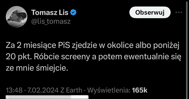 To jednoznaczny sygnał dla ewentualnych innych kandydatów strony rządzącej w wyborach prezydenckich. Wnioskuję, że najbardziej czytelny dla rotacyjnego marszałka i jego sponsorów zza oceanu. Jednocześnie to chyba jednak ukryta tęsknota i rozczarowanie. Bo trzymiesięczna ciężka orka nad wprowadzaniem „terroru praworządności” przyniosła nader mierne rezultaty. W każdym razie srodze zawiodła gorącego zwolennika rządzących, niejakiego Lisa Tomasza, publicysty celebryty, które zupełnie niedawno przewidywał totalną porażkę Kaczora.