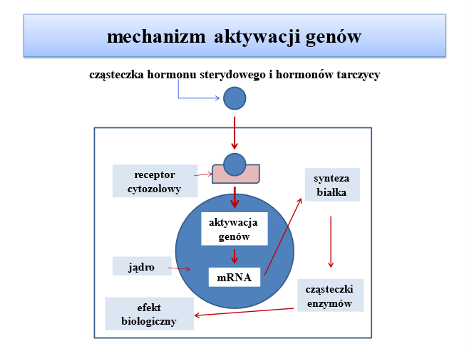 W skład receptorów cytozolowych wchodzi kilka tzw. domen, w tym m.in. wiążąca hormon (LBD – ligand binding domen), wiążąca DNA (DBD – DNA binding domen) – łączy się z DNA i „wybiera” geny, które zostaną aktywowane i aktywująca/hamująca transkrypcję genów. Hormon przenika przez błonę komórkową do cytoplazmy, gdzie zostaje rozpoznany i związany przez swoisty receptor. Powstały kompleks przemieszcza się do jądra komórkowego, gdzie dochodzi do rozpoznania przez DBD specyficznego odcinka DNA, a następnie aktywacji bądź hamowania transkrypcji genów. W efekcie powstaje mRNA, który bierze udział w procesie syntezy białka. W sumie żadnych konkretów, więc wszystko przed nami!